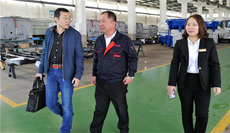 图为(左一)科晖专用汽车总经理杨志强介绍企业发展情况