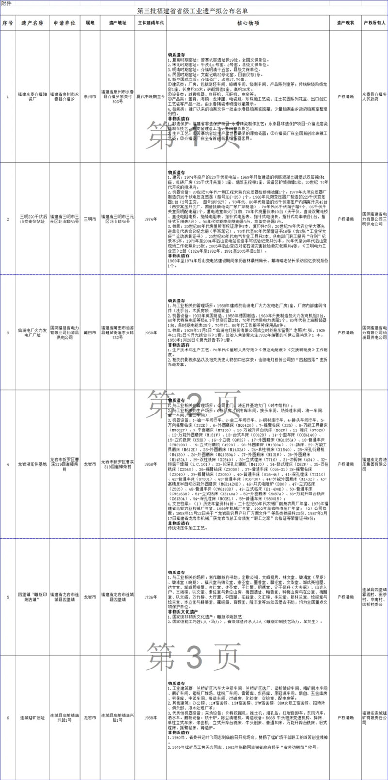 根据《国家工业遗产管理办法》(工信部政法函〔2023〕24号和《福建省工业和信息化厅关于征集福建省省级工业遗产的通知》(闽工信函服务〔2025〕88号)要求,经地市申报、材料初审、专家评审等程序,现将第三批福建省省级工业遗产拟公布名单予以公示。公示期内如有异议,请以书面形式向福建省工信厅提出,并提供必要的佐证材料。