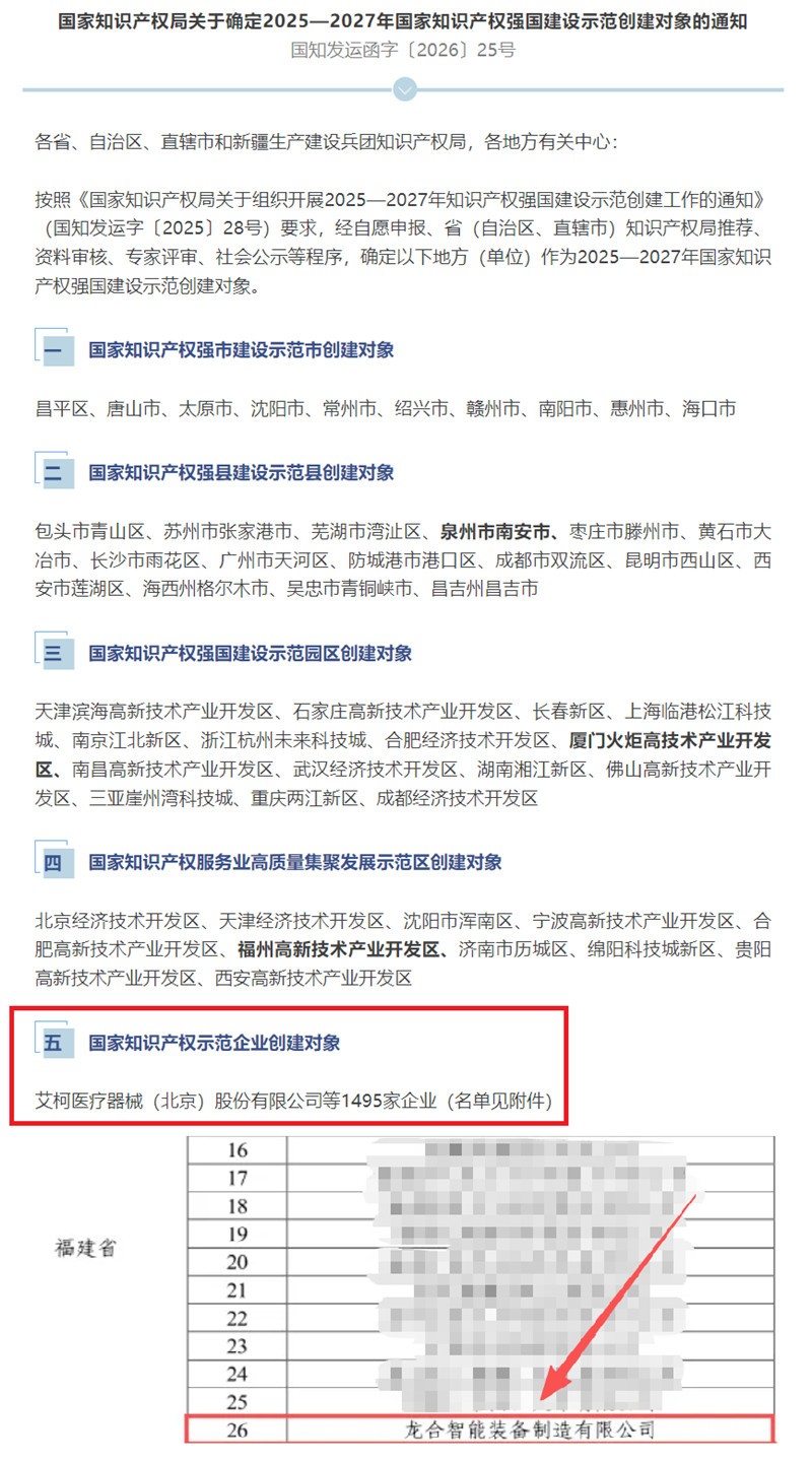 近日,国家知识产权局公布了2025-2027年国家知识产权强国建设示范创建对象名单,龙合智能凭借扎实的知识产权管理能力、突出的技术创新实力及高效的成果转化运用,成功入选2025-2027年国家知识产权示范企业创建对象!这是公司在知识产权领域入选的又一项国家级项目,是对公司技术创新、知识产权保护与运用工作的权威认可与高度肯定。